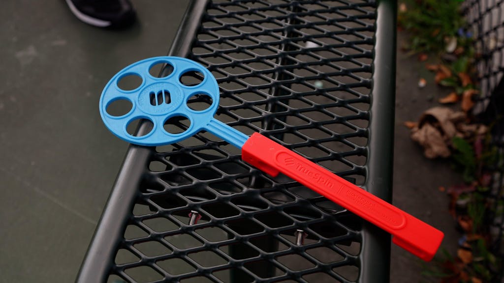 Our patent design features two parts. The first is a fiber reinforced composite handle, which attaches to the net. The second is an injection molded TPU target, which presses into the handle but can be removed or replaced easily for transport and storage.